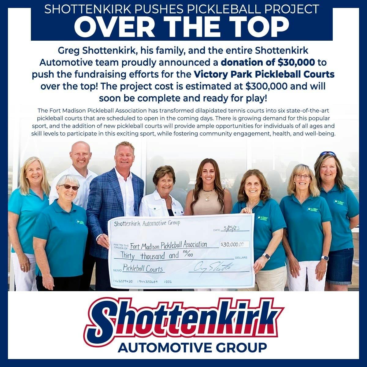 Greg Shottenkirk, his family, and the entire Shottenkirk Automotive team proudly announced a donation of $30,000 to push the fundraising efforts for the Victory Park Pickleball Courts over the top! The project cost is estimated at $300,000 and will soon be complete and ready for play!